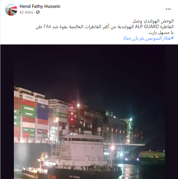 أعلنت هند فتحي المتحدث الإعلامي للهيئة الاقتصادية لقناة السويس، وصول القاطرة الهولندية ALP GUARD، والتي تعد من أكبر القاطرات العالمية على مستوى وذلك بهدف المساعدة في تحريك السفينة الجانحة بالقناة، عبر حسابها الرسمي على موقع فيس بوك.