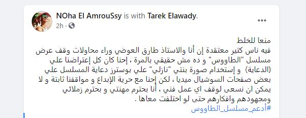 ونفت الفنانة بعدما خرجت مساء أمس عبر حسابها على تويتر مؤكدة انها لا تمت بأي صلة للشكاوى المقدمة تجاه العمل الفني، مؤكدة انها تدعم حرية التعبير والفن وانها تحترم مجهود زملائها في العمل الدرامي.