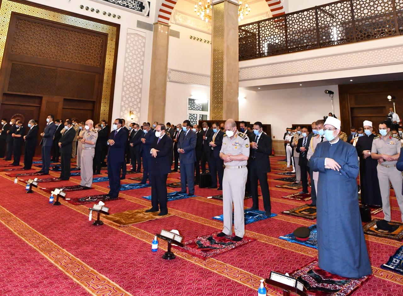قال السفير بسام راضي المتحدث الرسمي باسم رئاسة الجمهورية : أدى صباح اليوم الرئيس عبد الفتاح السيسى والدكتور مصطفى مدبولى رئيس مجلس الوزراء والفريق أول محمد زكي القائد العام للقوات المسلحة وزير الدفاع والانتاج الحربى، والفريق محمد فريد رئيس اركان حرب القوات المسلحة، وقادة الأفرع الرئيسية للقوات المسلحة، وعدد من الوزراء، وكبار رجال الدولة صلاة عيد الاضحي المبارك بمسجد مالك الملك بمدينة العلمين الجديدة.