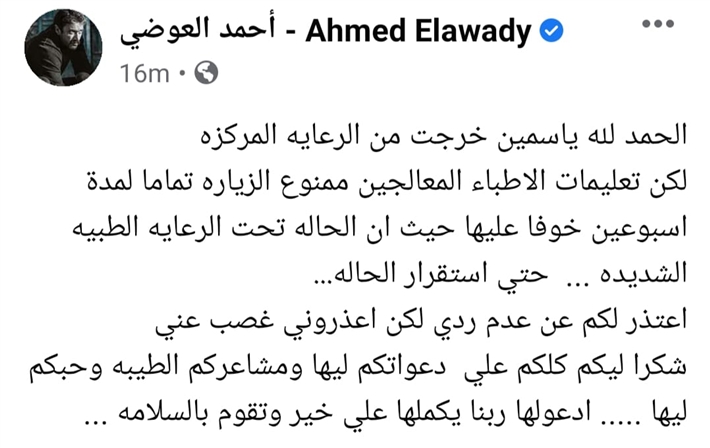 وفي سياق متصل، كتب الممثل وائل عبد العزيز شقيق "ياسمين" : "الحمد لله خرجت من العنايه المركزه بفضل ربنا وكل الي بيحبوها بس مفيش زيارت"، وذلك عبر حسابه الشخصي على "فيسبوك" أيضاً.