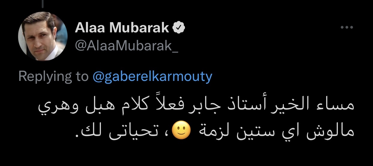 ورد علاء مبارك على تغريدة الإعلامي جابر القرموطي الذي نشر مقطع فيديو على "تويتر" تحدث فيه عن قراءته مقالا تحدث عن خلاف بين أسرة الرئيس الراحل محمد حسني مبارك والراحل المشير حسين طنطاوي، استند لغياب علاء مبارك عن عزاء الأخير.