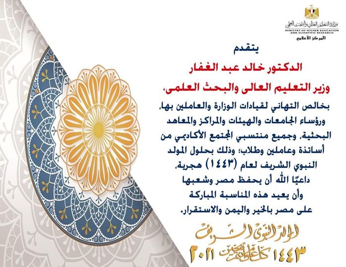 تقدم الدكتور خالد عبدالغفار وزير التعليم العالي والبحث العلمي، بخالص التهاني لقيادات الوزارة والعاملين بها، ورؤساء الجامعات والهيئات والمراكز والمعاهد البحثية، وجميع منتسبي المجتمع الأكاديمي من أساتذة وعاملين وطلاب؛ وذلك بحلول المولد النبوي الشريف لعام (1443) هجرية، داعيًا الله أن يحفظ مصر وشعبها وأن يعيد هذه المناسبة المباركة على مصر بالخير واليمن والاستقرار.