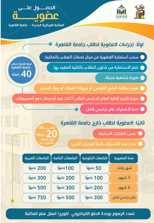 أعلنت جامعة القاهرة عن الإجراءات اللازمة للالتحاق بعضوية المكتبة المركزية الجديدة التى تم افتتاحها فى الجامعة وذلك بالنسبة للأساتذة الجامعيين والباحثيين وكذلك الطلاب.
