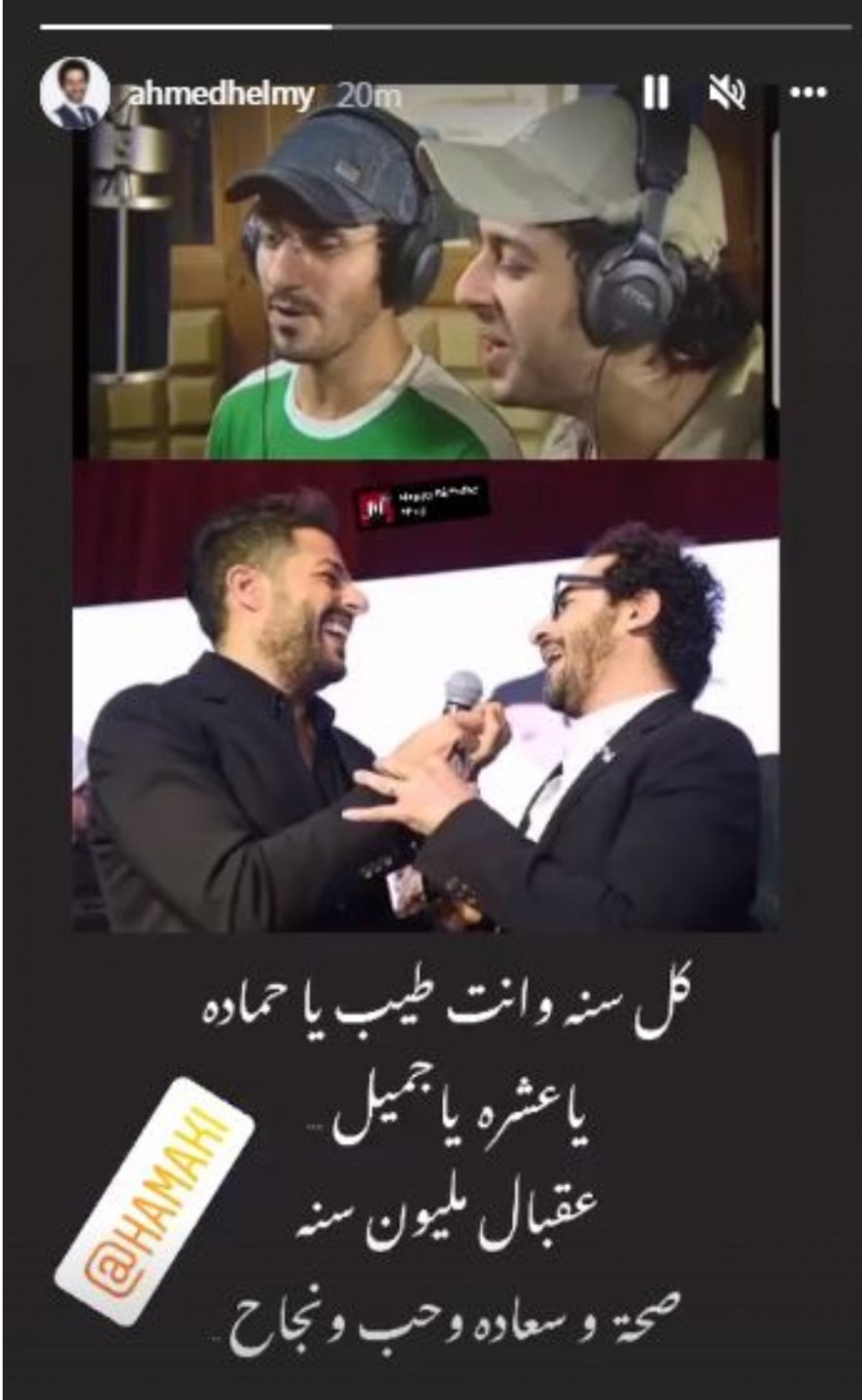 بعيد ميلاد المطرب محمد حماقي الموافق اليوم الخميس،حيث نشر الفنان أحمد حلمي عبر الاستوري الخاص بحسابه علي "إنستجرام " صورة تجمعه بالمطرب من محمد حماقي من كواليس أغنية "واحدة واحدة "فيلم "جعلتني مجرما "وكتب "كل سنة وأنت طيب يا حمادة يا عشرة يا جميل.. عقبال مليون سنة صحة وسعادة وحب ونجاح".