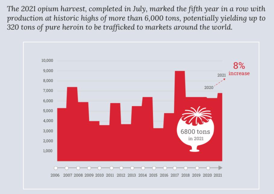 أصدرت منظمة الأمم المتحدة المعنية بالمخدرات والجريمة تقريراً حول المخدرات في أفغانستان أوضح أن حصاد الأفيون قد ارتفع بنسبة 21% في 2021 بالمقارنة بالعام الماضي، حيث وصل إلى 6,800 طناً من الأفيون، وهو ما قد يؤدي إلى تهريب حوالي 320 طناً من الهيروين من أفغانستان إلى الأسواق المختلفة حول العالم.