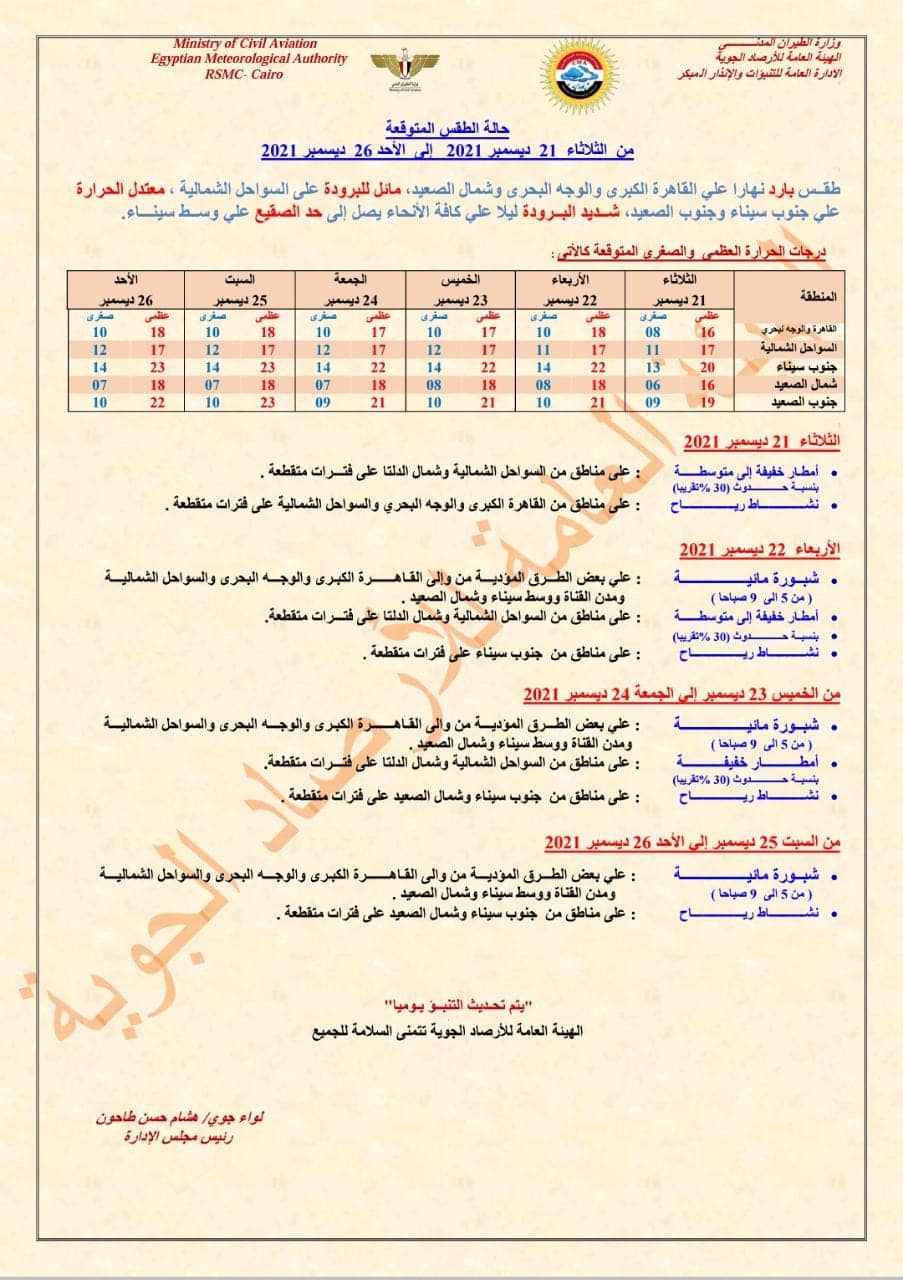 أعلنت هيئة الأرصاد الجوية، درجات الحرارة وحالة الطقس المتوقعة خلال الإسبوع الجاري بدءً من اليوم الثلاثاء 21 ديسمبر وإلى الأحد الموافق 26 ديسمبر 2021، وجاءت التوقعات على النحو التالي: