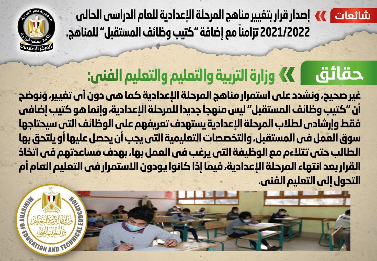 وقد تواصل المركز الإعلامي لمجلس الوزراء، مع وزارة التربية والتعليم والتعليم الفني، التي نفت تلك الأنباء، مُؤكدةً أنه لا صحة لتغيير مناهج المرحلة الإعدادية للعام الدراسي الحالي 2021/2022 تزامناً مع إضافة "كتيب وظائف المستقبل" للمناهج، مُشددةً على استمرار مناهج المرحلة الإعدادية كما هي دون أي تغيير.